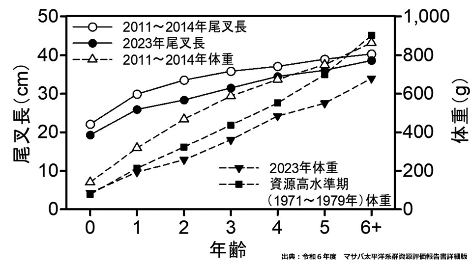 上のグラフから近年、マサバの年齢に対して、重量の増加ペースが遅くなっていることがわかります。例えば、同じ5歳魚でも、2023年時点での5歳魚の重量は550g程度であり、2011~2014年時点での5歳魚の7割程度の重量にしか育っていません。