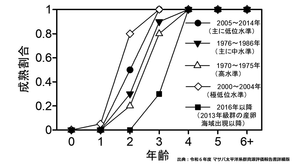 資源量が低水準の時期は、成熟が早まり2歳で半数が成熟し、3歳ですべて成熟します。